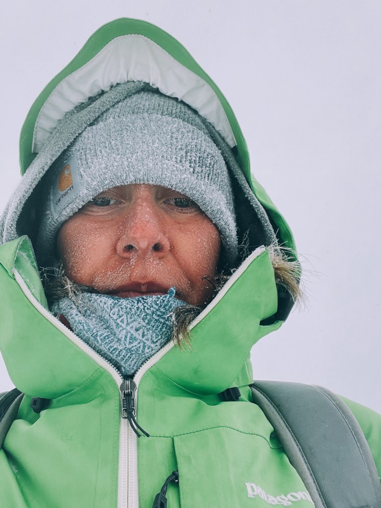 Three frosted faces emerge from the cloud of white coming towards me on the trail.